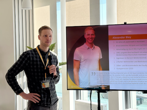 Auch Sebastian Salomon und Janine Dersch nutzten die Gelegenheit, einmal mehr in Sachen Cochlea-Implantat aufzuklären und bei den anwesenden Journalisten um Unterstützung zu werben: „Das Cochlea-Implantat verhilft Menschen seit vier Jahrzehnten zu deutlich mehr Lebensqualität“, so Sebastian Salomon. „Dennoch bestehen nach wie vor große Wissenslücken. Sehr viele Betroffene, die erheblich vom CI profitieren könnten, finden nicht bzw. viel zu spät Zugang zur Therapie. Hier Barrieren abzubauen, ist eine wichtige Aufgabe, die wir nur gemeinsam meistern können. Da sind alle an der Hörversorgung beteiligten Berufe und Institutionen gefordert, ebenso die Interessenvertretungen der Patienten sowie Politik und Gesellschaft.“